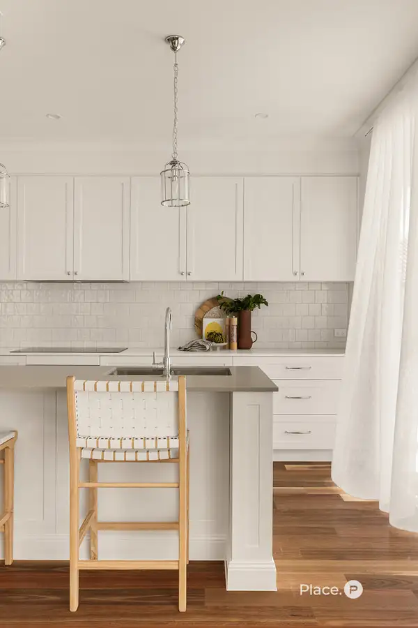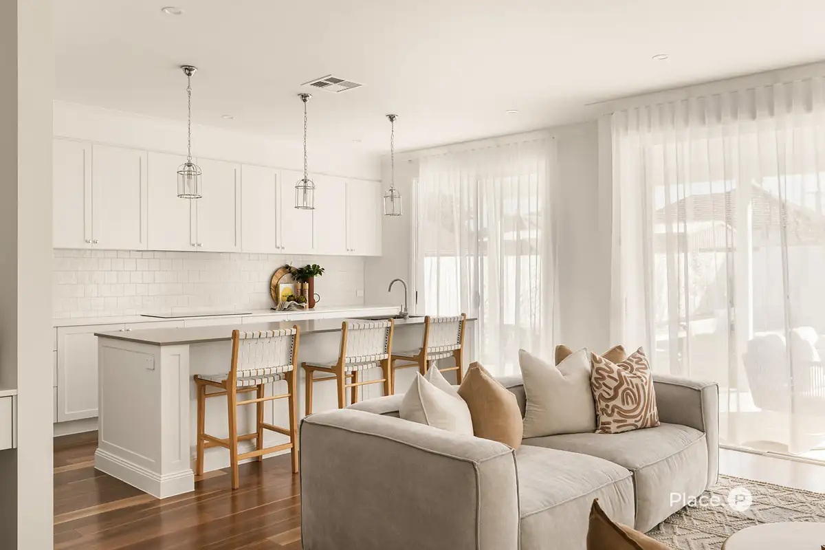 Designed as a culinary centrepiece, the kitchen creates cohesion between the living spaces and showcases modern elegance with a feature island bench, pendant lights, Smeg appliances and a butler's pantry.