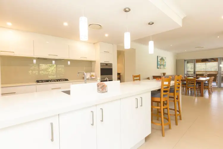 The internal flow of the home allows for maximum entertainment. The kitchen is large, with caeserstone bench tops with waterfall edging, plumbed in fridge provisions, quality appliances and a massive walk in pantry with sensor lighting. Open plan living enables the kitchen to overlook the lounge room, which comes complete with a built in entertainment unit, sliding doors and views out onto the swimming pool. Plantation shutters allow a slight view of a second casual lounge room with more sliding doors opening onto brilliant pool views. The home swings around from this room back onto the dining room, which leads onto a fabulous undercover alfresco area complete with a feature fan, shade blinds on all open areas, built in seating and incredible pool views.