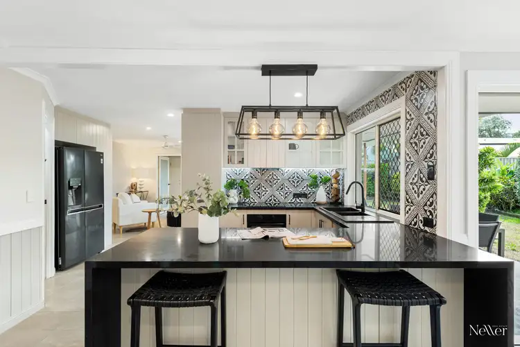 Comprising three bedrooms, two bathrooms, elegant new kitchen with walk-in pantry, two separate living areas, north facing covered patio with fly-over awning, new laundry, and double carport plus gated side access to park caravan or boat – it is the perfect size for a couple or small family, with a child and pet-friendly yard.
