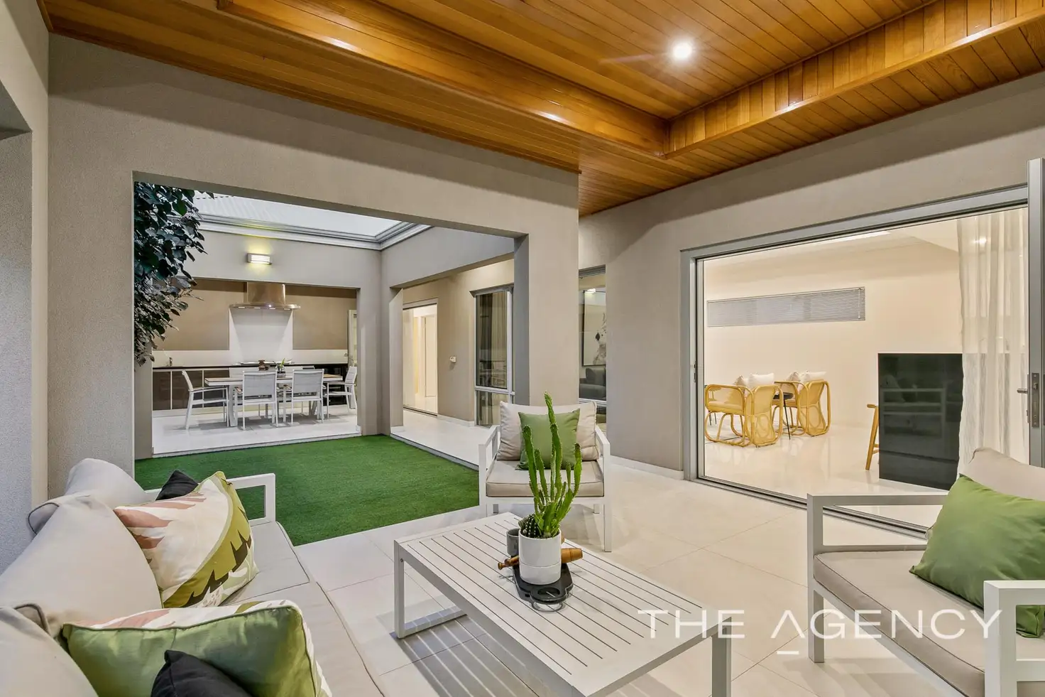 - Multiple living areas inside and out. Separate theatre room, open dining/family area overlooking a one-of-a-kind private undercover dual alfresco area featuring , café blinds, built-in kitchen/BBQ, wine and beer fridges on one side and a pleasant sitting wing on the other