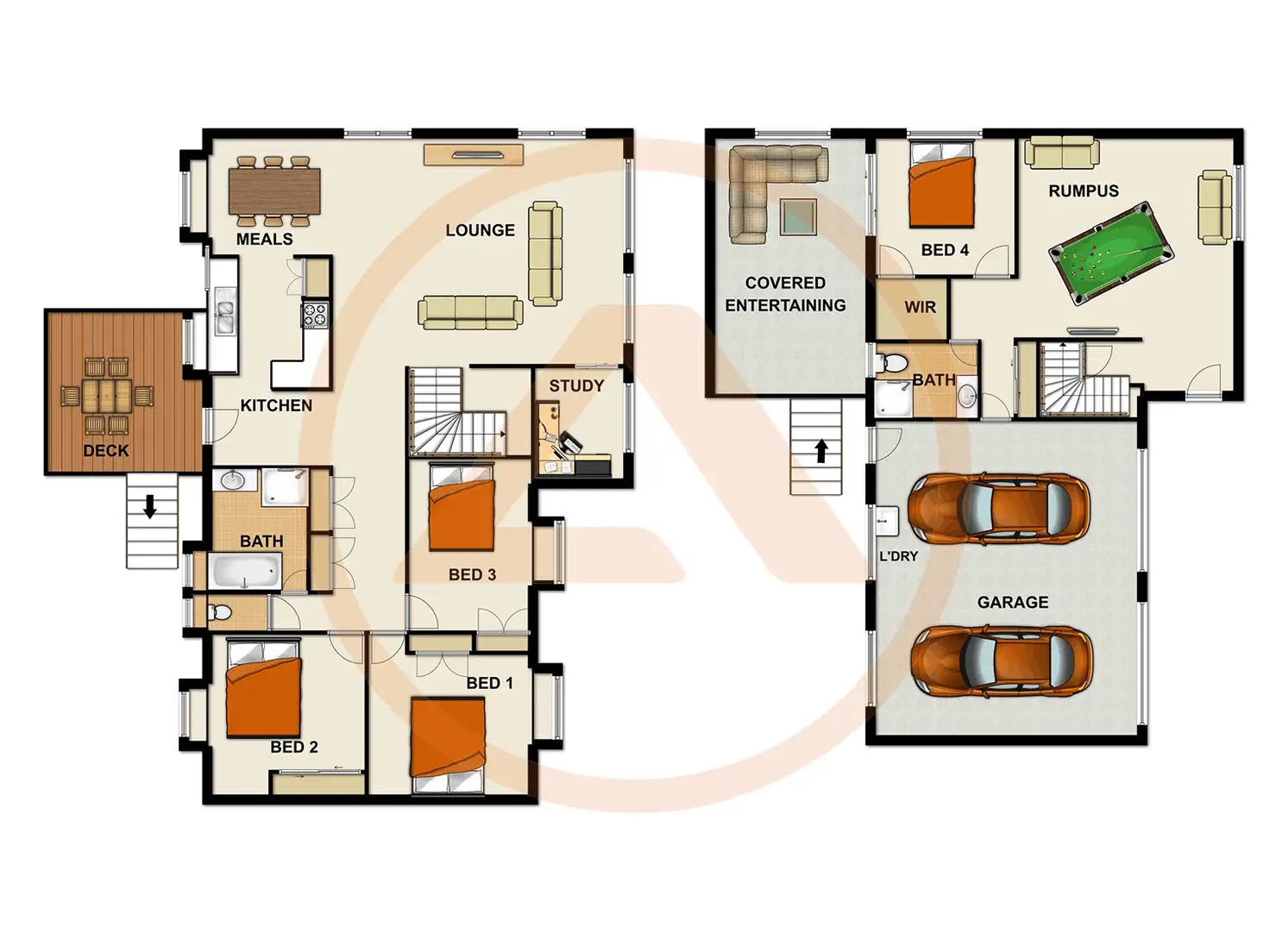 As you step through the down stairs front door you will be greeted by a large and very spacious rumpus/media room serviced by a newly renovated second bathroom with a separate bedroom all on the lower level. The separate adjoining larger than normal remote controlled double garage provides loads of storage, the down stairs laundry and allows internal access to the main house.