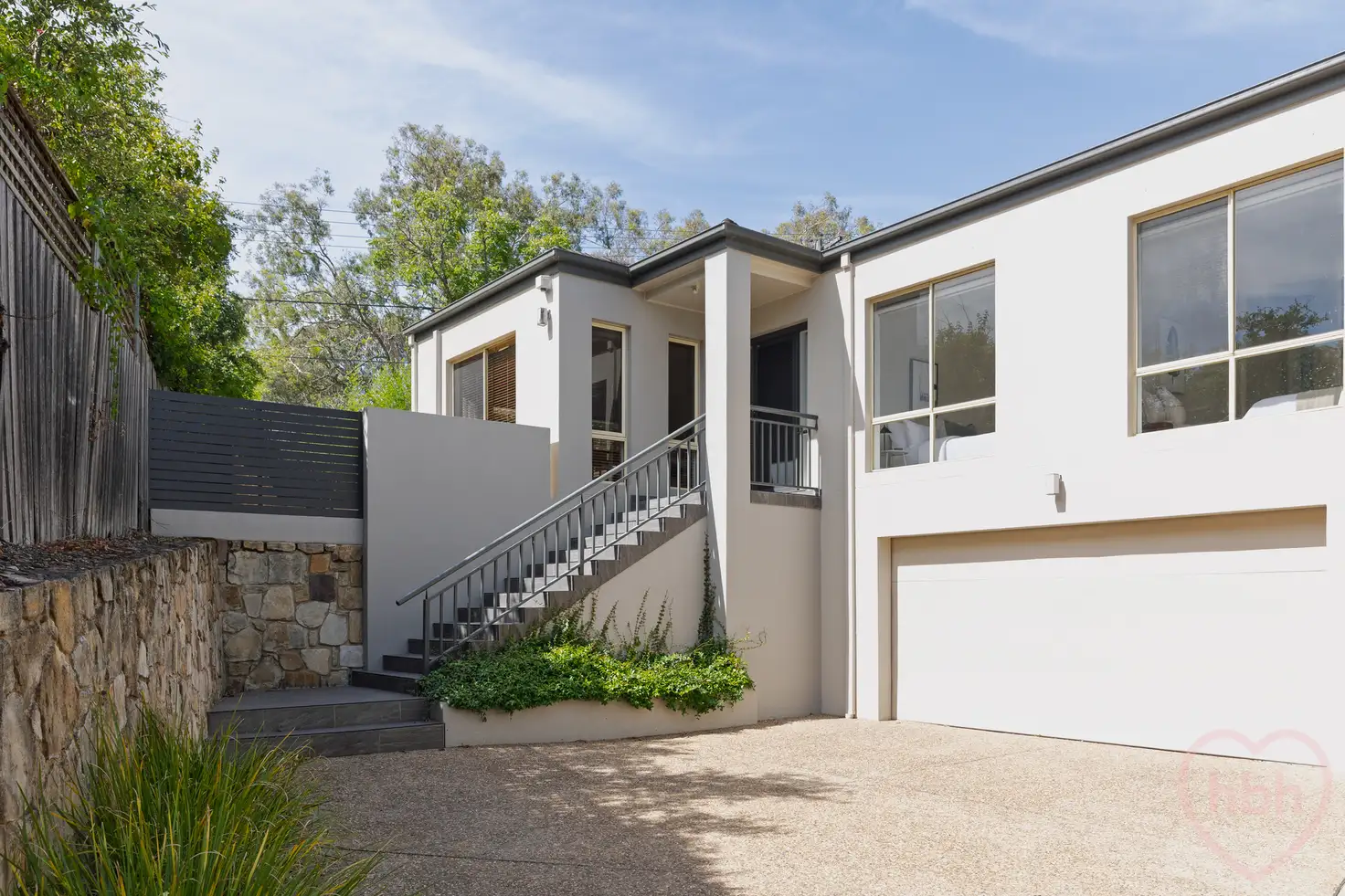 The home sits at the end of long driveway, at the apex of a battle-axe block. Sandstone retaining walls are edged with strappy agapanthus, native grasses, heralding to a double garage with internal access. The form has a classic feel, think rendered taupe walls, dark iron balustrade and slate grey paved steps, ushering upward, to a sheltered front porch and a welcoming front door, flanked by a duo of sidelights.