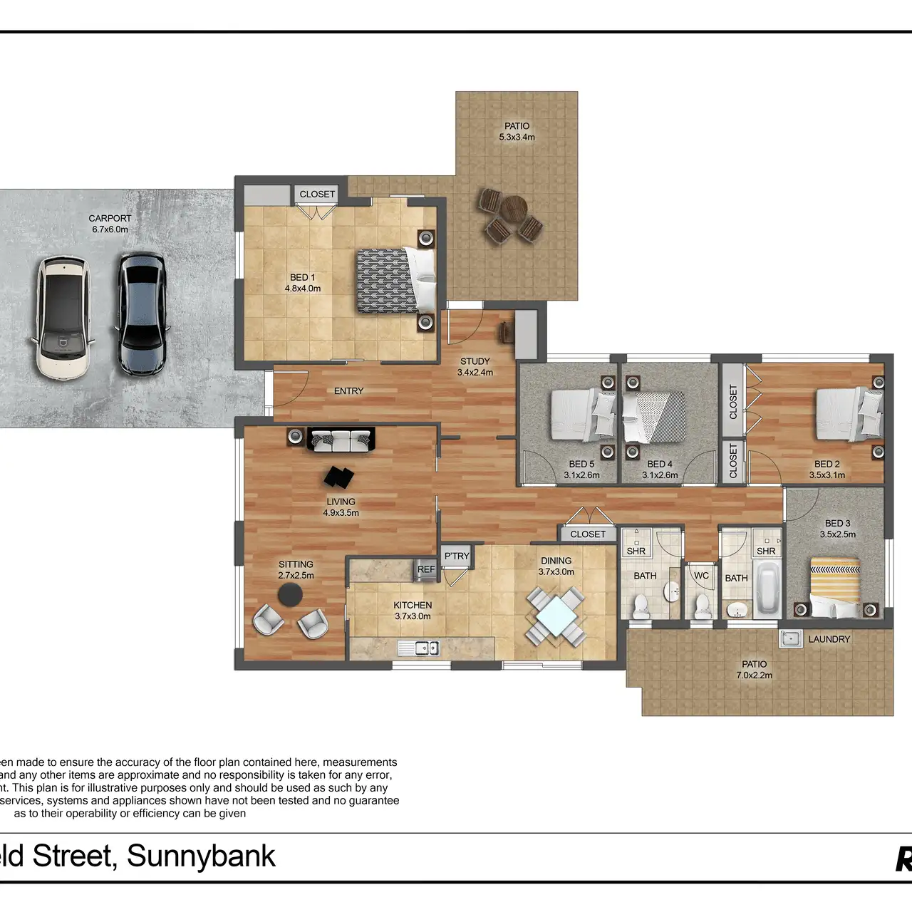 Step outside to discover a covered alfresco area, providing ample space for outdoor furniture and children to play. It's the perfect spot to unwind, savor a cold beverage, and enjoy the aroma of a sizzling barbecue. Additional features include an undercover carport with parking for two cars.