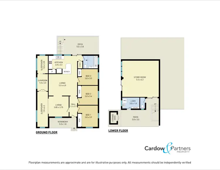 Bedroom one (3.8 x 3.9m), bedroom two (3.8 x 3.4m) and bedroom three (3.8 x 3.0m) have hardwood timber floors, built-in robes and ceiling fans.