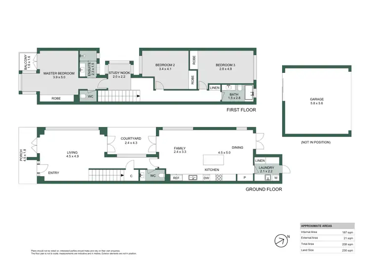The mix of materials, including the Tasmanian Oak flooring, large timber-framed windows and doors, and feature lighting, creates clean lines and warm tones. The kitchen features timber cabinetry, a granite countertop, and a mottled green glass splashback reflecting a decked internal courtyard connecting the outdoors, with direct access to two courtyards from the open-plan living and dining room. Upstairs, a study encased with timber-clad and large windows creates a working zone with the same design reflected in the primary bedroom leading to a balcony overlooking the leafy street.