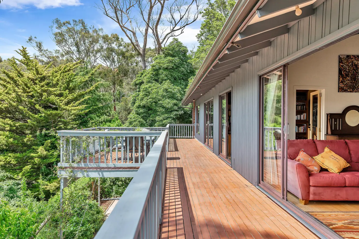 Get amongst it or relish it from within. Grab a book from the library, or settle into the living room's warm, sunny space where glass doors open onto the beautiful hardwood deck hovering among the trees.
