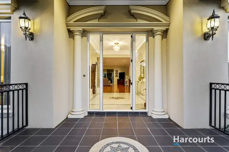 Boasting an impressive street appeal, a grand frontage invites you to a wide entrance hall with quality porcelain tiles, high ceilings throughout and hardwood flooring in all living areas. To the left is a spacious formal lounge with views across the gardens and an atrium with a water feature creating a relaxing ambience. Flowing from the lounge you have the huge formal dining room, perfect for entertaining large groups of guests and from there you enter a light-filled open plan family and meals area with a gas fireplace and a chef's kitchen overlooking the space with stainless steel appliances, granite benches, an island breakfast bench and stunning Jarrah wood cabinetry.