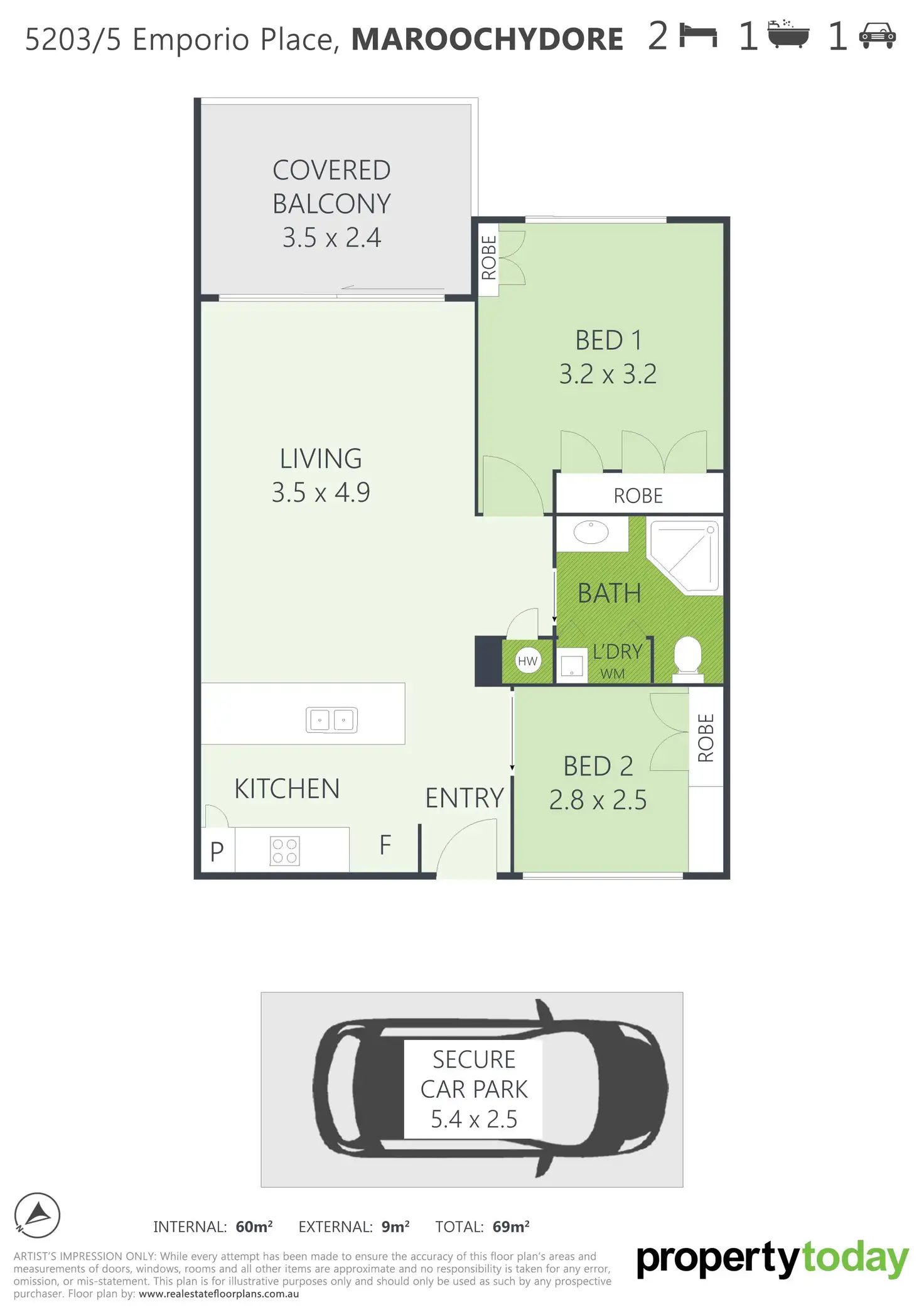 2 Bed • 1 Bath • 1 Car • 69m²