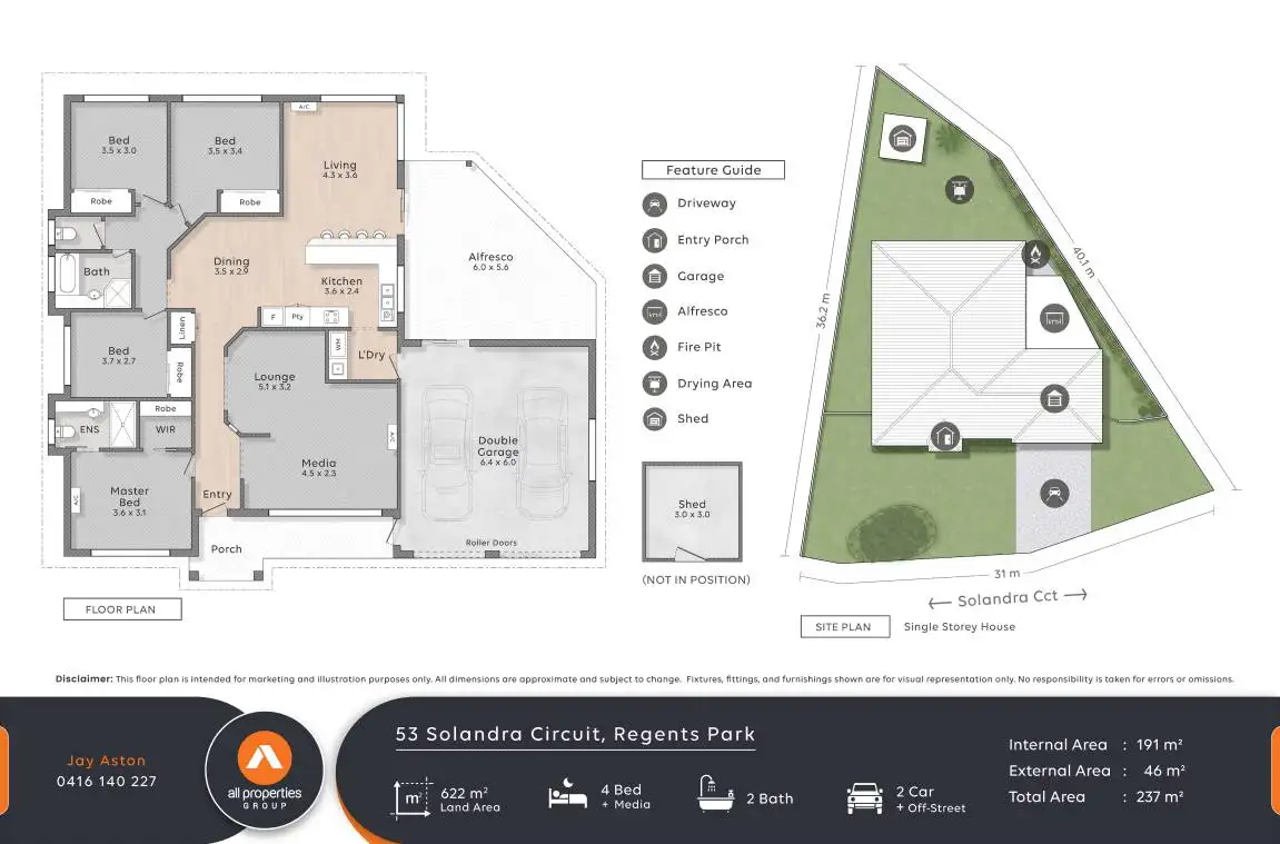 53 Solandra Circuit, Regents Park. Perfectly positioned in a quiet, family-friendly neighbourhood, this immaculately presented contemporary low-set home offers the ideal blend of modern comfort, thoughtful design, and spacious living – all set on a large 622m² block. With four bedrooms, two bathrooms, multiple living areas, and a double lock-up garage, this home ticks every box for relaxed family living and effortless entertaining.