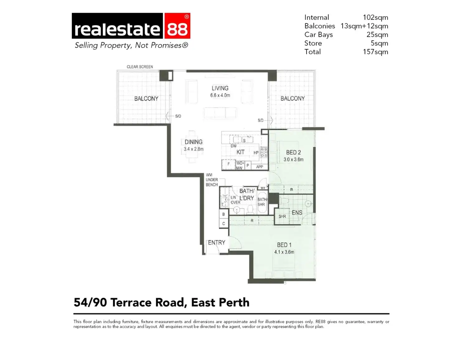 Internal: 102sqm; South Balcony: 13sqm; North Balcony: 12sqm; Car Bays: 25sqm; Store: 5sqm; Total: 157sqm