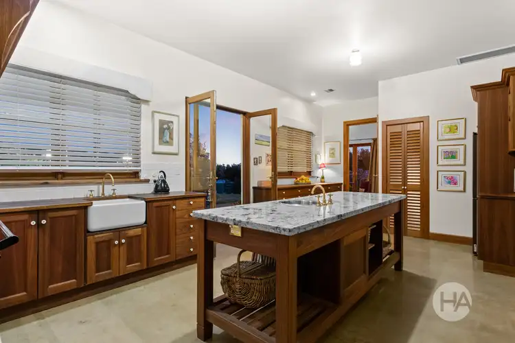 The country kitchen is a harmonious blend of elegance and functionality, featuring a butler’s pantry and classic AGA stove. A striking marble-topped island serves as a sophisticated focal point, while rich spotted gum cabinetry adds warmth and character. French doors open to the cottage garden, seamlessly merging indoor and outdoor living, ideal for both culinary creativity and peaceful retreats.