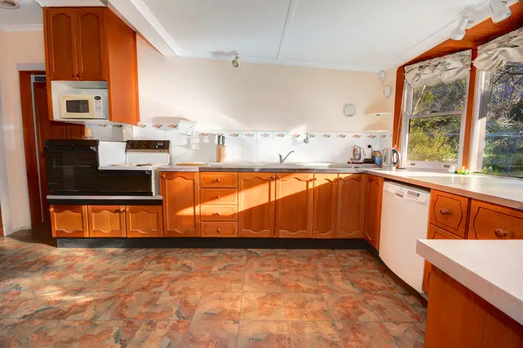 The interior of the home enjoys a comfortable layout with 3 bedrooms, plus a handy study/small fourth bedroom. The front door entry way is a spacious and slate-tiled, leading to a generous corridor accessing the bedrooms, all situated on the south side of the house. The L-shaped living area is divided into three sections, separated by archways and enjoying a sunny northern aspect. A large dining area/family room is central to the house, skylit and bright. Adjacent this this, overlooking the back garden, is a large, country-style kitchen (with walk-in pantry, large bay window and laundry nook), leading to an expansive, covered outdoor entertaining area. Entertaining is a pleasure on this sheltered terrace, flowing to a lovely garden, enjoying pleasant borrowed views over wooded neighbouring properties.