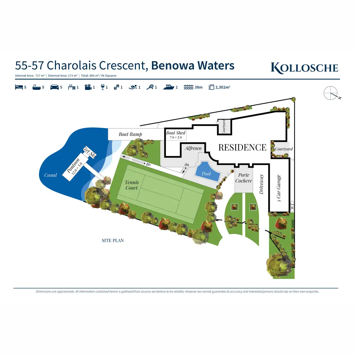 • 5 bedrooms, 5.5 bathrooms and a 5 car garage, on a double 2,302m2 block, with 31.3m water frontage;