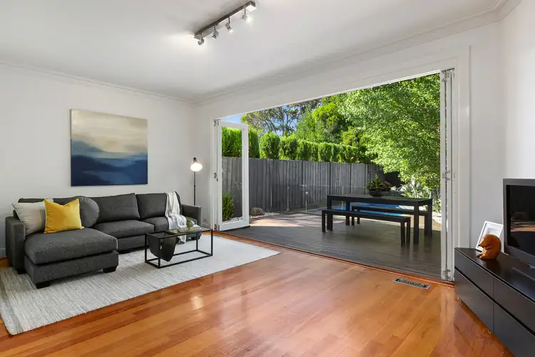 The home spectacularly opens up to reveal far-reaching, open-plan living and dining, and a sleek, Caesarstone-topped kitchen featuring the full complement of high-end Smeg appliances and a welcoming breakfast bar. Relaxed in nature, the home effortlessly flows outdoors through a set of bi-fold doors to reveal a private, northeast-facing deck, solar-heated swimming pool and poolside terrace. Presenting a whole range of possibilities, take the opportunity to entertain family and friends alfresco at any time of the day or year.