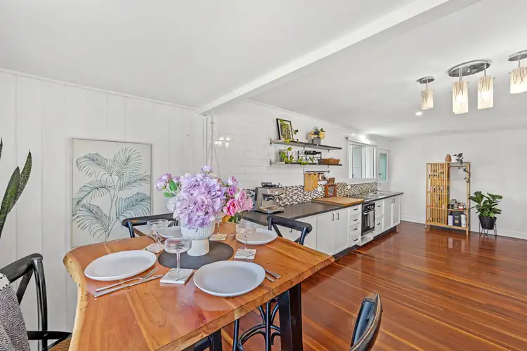 Open plan kitchen, living, and dining area that seamlessly flows to a fully decked outdoor space.
