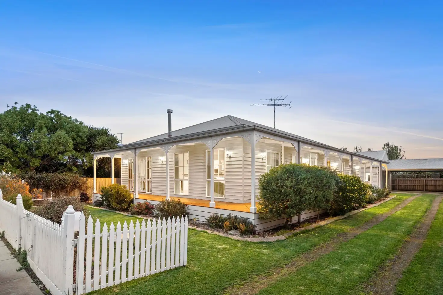 -Weatherboard façade and picket fence create a charming farmhouse feel from the outset