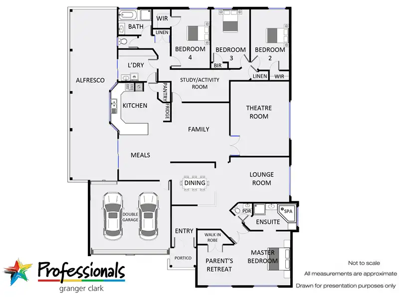 *King size master bedroom with large parents retreat, walk in robe and generous ensuite with spa bath and separate toilet (which is also a powder room) and located at the front of the property