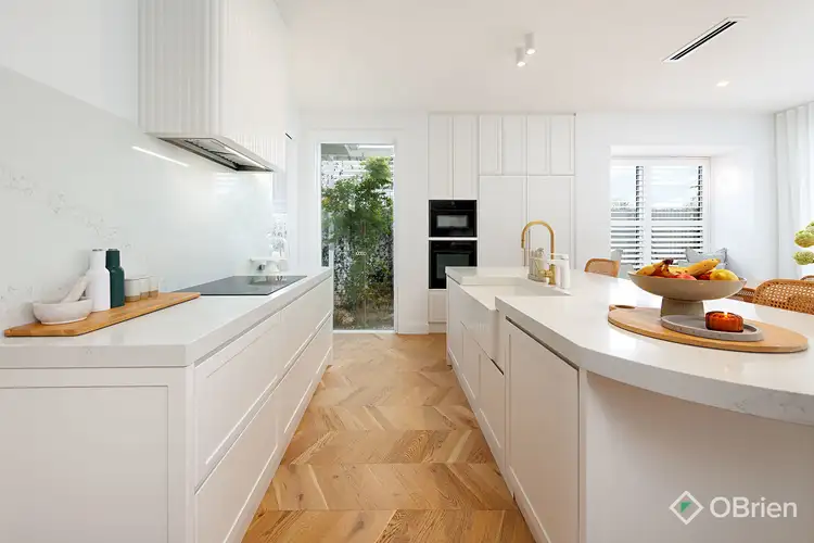 The chef's kitchen impresses with 2-pac cabinetry, natural quartz stone benchtops, integrated Miele and Neff appliances, and a full butler's pantry with sink and dish drawer dishwasher. Chevron engineered timber flooring, wool loop carpets, and 2.7m ceilings downstairs enhance the home's elegance, while thoughtful inclusions such as keyless entry, Google Home integration, motorised blinds, and PVC shutters highlight its modern intelligence.