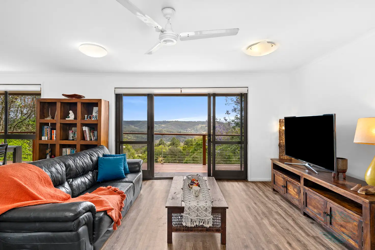 - Family size lounge with double sliding doors accessing the balcony and taking in the expansive views, wood burning fireplace and ceiling fan