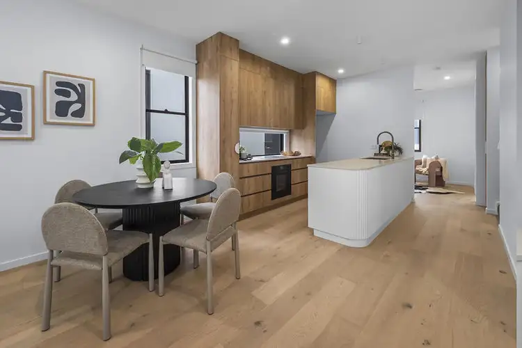 Open plan living & dining areas with engineered timber floors and 2.7m high ceilings