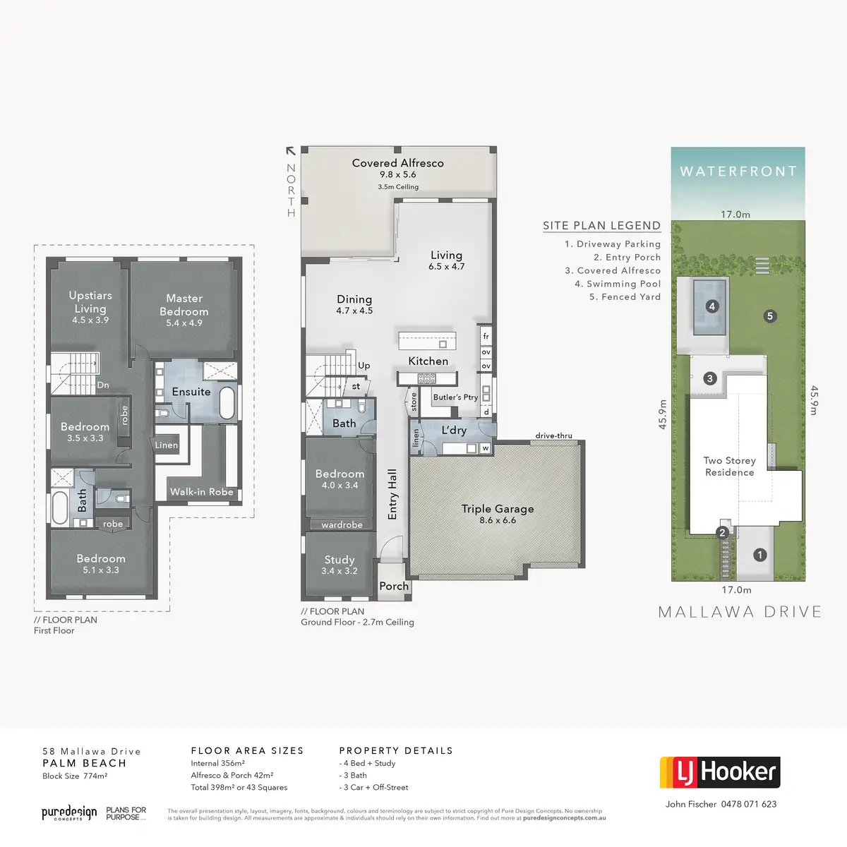 * Light-filled living and dining downstairs and upper level living zone, both with water views