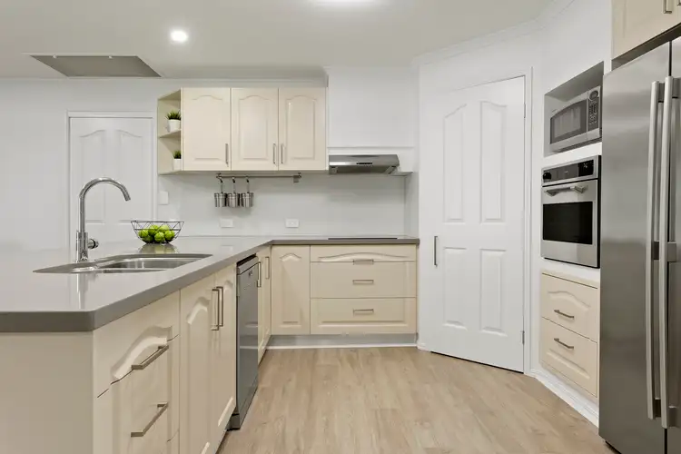 The gourmet kitchen features quality appliances with oversized stone bench tops and cupboard storage space. The kitchen is perfectly positioned to overlook the open family/living area and dining area, as well as the fully covered patio and private bushland.