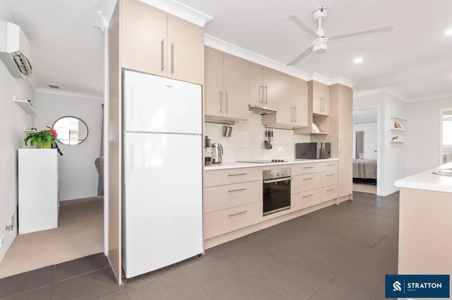 Led downlights grace the kitchen and dining area, adding a touch of modern elegance. The dining area itself features a ceiling fan, enhancing the comfort of this beautiful home.