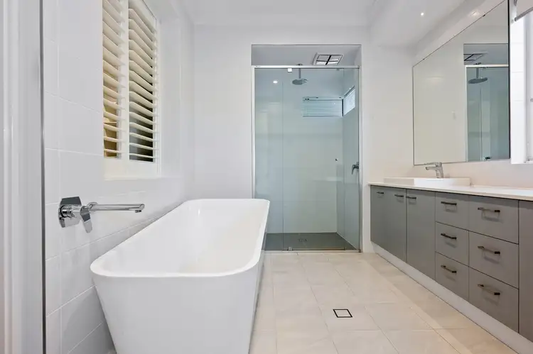 The master suite offers true luxury with a spacious ensuite, ample cabinetry, and a freestanding deep soaking tub. The expansive walk-in robe with a dressing table is a dream for fashion enthusiasts.
