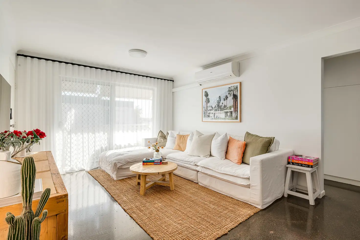 - Polished concrete flooring in living and plush near-new carpets in bedrooms