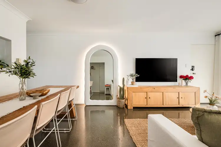 Entering this top-floor apartment, you will be impressed with the quality of finishes and abundance of natural light. Modern polished concrete flooring compliment the neutral colour scheme and provide low maintenance living. The well-sized kitchen will delight the chef in the family with high-quality appliances, plenty of bench space and a window through to the main living area – providing connectivity to the rest of the home. The living and dining area are generous in size for an apartment and flow seamlessly to the covered balcony with feature tiling and fantastic breezes.