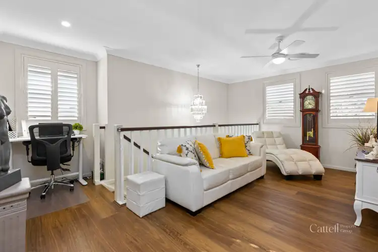 Upstairs, a striking chandelier suspended in the stairwell sets a tone of elegance. A second living area offers additional space to relax, while three generously sized bedrooms feature plush carpeting and built-in robes.