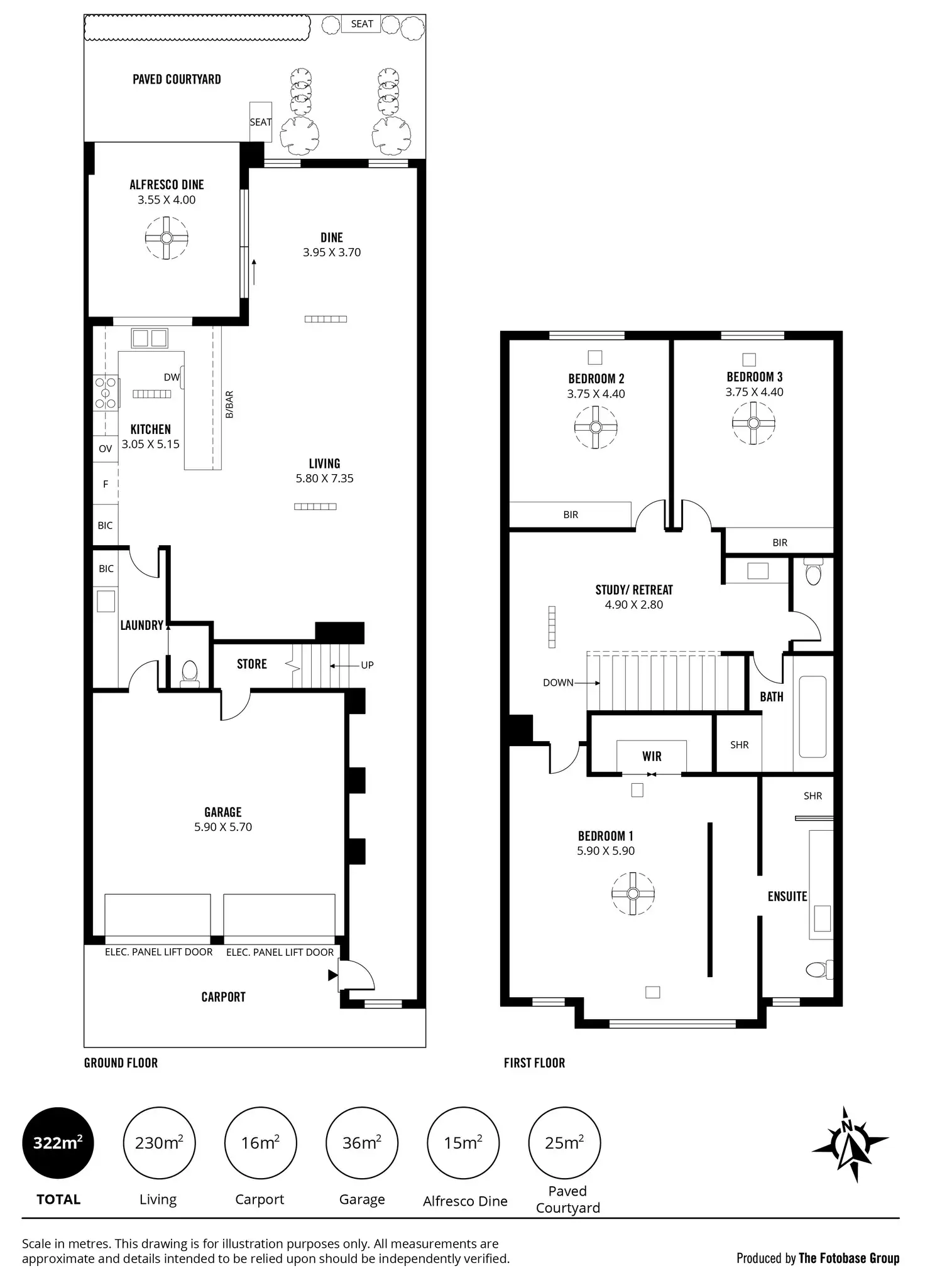 • Fan-cooled alfresco entertaining area extending into a private paved courtyard with built-in bench seating and lush plantings