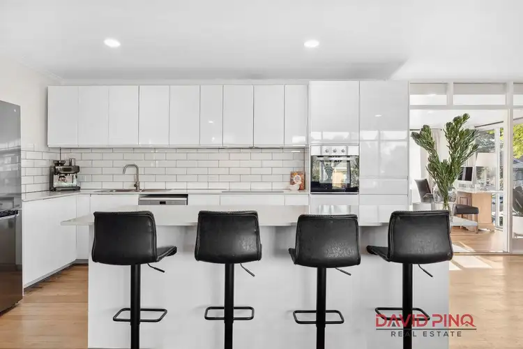 As you step inside, you'll be greeted by the sleek, open-plan kitchen and dining area, flooded with natural light and filled with the warmth of polished hardwood floors. The modern kitchen is equipped with top-of-the-line appliances, ample cabinetry, and a large island bench perfect for food preparation and casual dining.