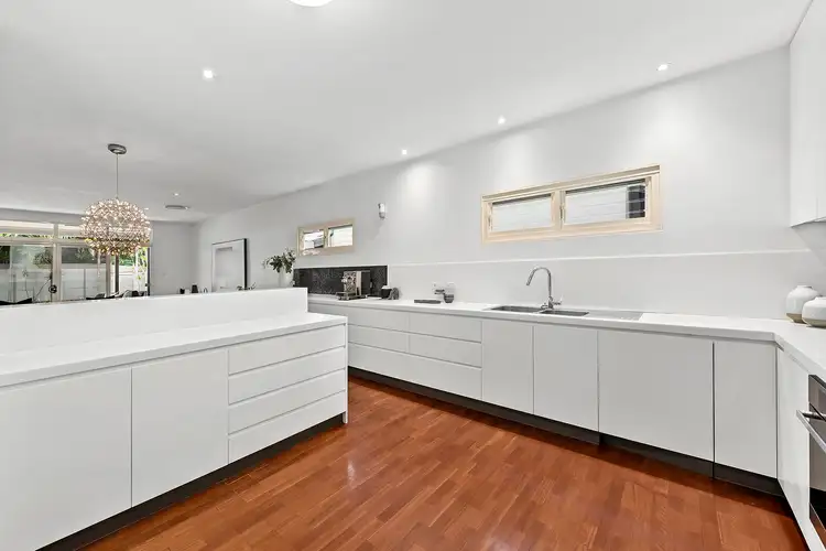 Once you step inside, you'll notice how it's perfect for today's modern family with a flowing floorplan that focuses on easy living and entertaining. The home comprises numerous formal and casual living spaces with crisp white decor, high ceilings throughout, timber flooring, and seamless interaction with the outdoors. A superbly appointed kitchen includes 60mm white Corian benchtops and custom cabinetry alongside an array of Miele appliances.