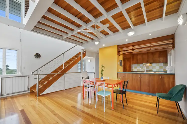 A timber staircase takes you to the upper level, like a loft, which is taken up entirely by the master suite, including the bedroom, ensuite and walk-in wardrobe.