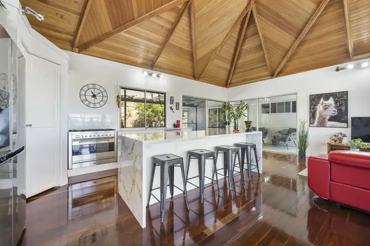 The stunning kitchen illuminates with natural light, high timber domed ceiling, beautiful polished timber floors and is the hub of the home, an abundance of draws and cupboards, gas cooking, modern appliances, wood burner, dining area, living area, air conditioning, sliding doors seamlessly leading out to the timber deck, working in the kitchen will be a pleasure with such great views!