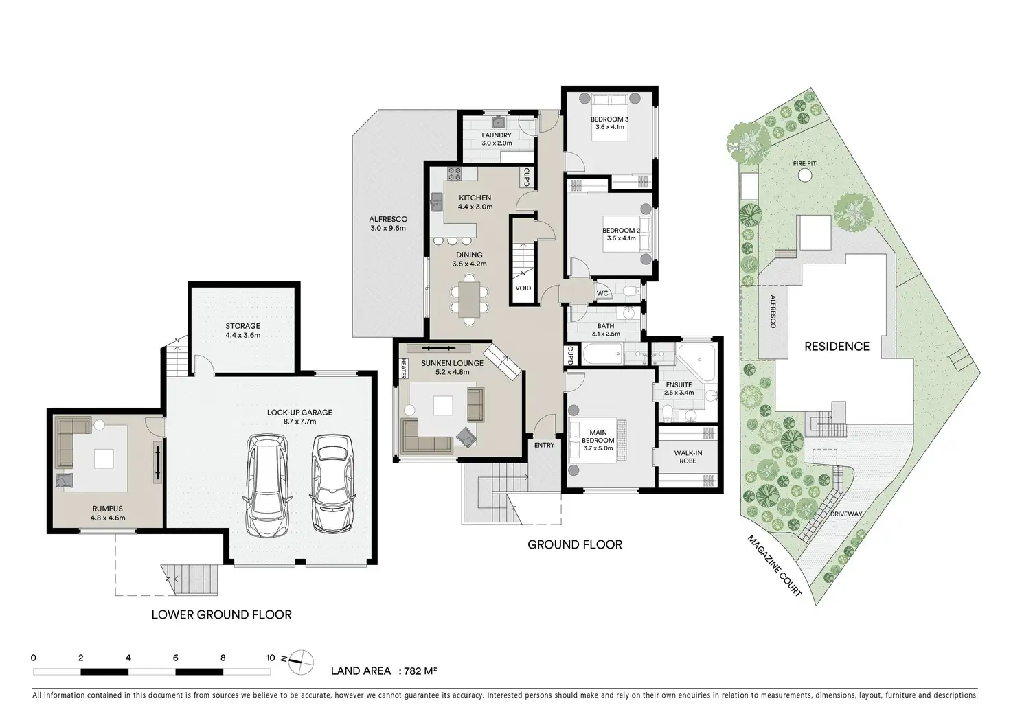 • The three generously sized bedrooms on the main level include a master bedroom with a hidden ensuite complete with a corner spa, shower, vanity, and toilet. The master also boasts a large walk-in robe cleverly disguised within its design.