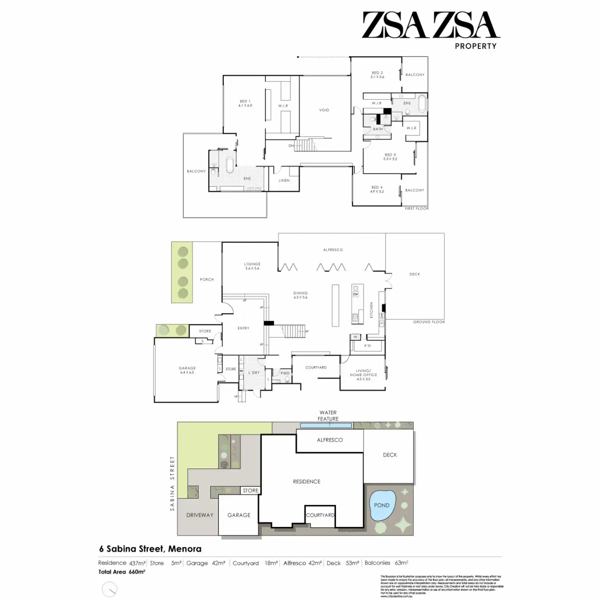 Upstairs the main bedroom suite commands the southern end of the home. With its own balcony, spacious walk-in-robe and luxurious ensuite, this space is both private and well-appointed. Each of the secondary bedrooms are oversized and feature access to north facing balconies, with two of the bedrooms featuring walk-in-robes and ensuite access.