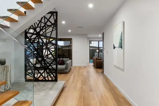 Set back from the street, this stunning piece of Sabdia architectural brilliance is available in a rare opportunity in Rochedale. This striking, high-end home boasts 550 square metres of luxurious floorspace tucked behind the ultra-modern façade. Enter through the private courtyard with secure CCTV system into the home via the huge frosted glass door. The overhead void is adorned with a designer crystal chandelier and uplights that illuminate the timber hall leading into the heart of this extravagant home. The sleek concrete finish lends an industrial air and ushers you into the home office fitted with blockout curtains, custom cabinetry and LED's to highlight the bulkhead ceiling.