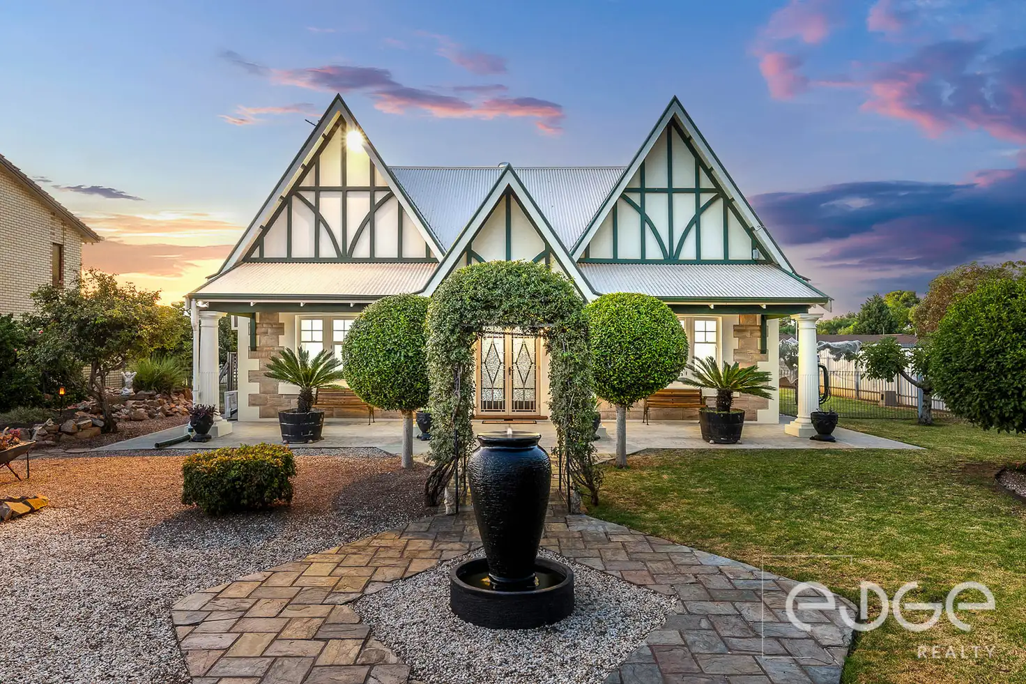 Mike Lao, Brendon Ly and Edge Realty RLA256385 are proud to present to the market this exquisite masterpiece of character and charm - a circa 1930s Tudor-style sandstone home nestled on a 1,400sqm approx corner block. Framed by beautifully landscaped gardens and a serene water feature, this residence offers an idyllic lifestyle for families seeking space, elegance, and functionality. Securely positioned behind a fully fenced perimeter with an electric side gate, the home ensures privacy and convenience while exuding timeless appeal.