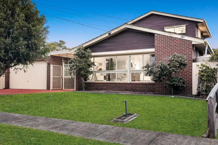 The home reflects typical Australian suburban architecture, characterised by dark clinker bricks, a low-pitched asymmetrical gable roof and a facade that blends horizontal timber cladding with wide aluminium-framed windows. A front-facing garage with secure metal gates adds to the functionality, while the solid composition and uncluttered exterior reflect modest Mid-Century Modern influences.