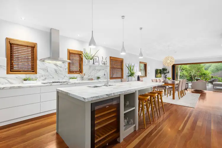 A highlight is the magnificent honed marble, Miele appointed centrepiece kitchen that merges with the expansive living and dining and spills out through two walls of bi-folds to the wraparound spotted gum decks partially covered with a Vergola. The private abode enjoys expansive manicured back lawns that the children will love.