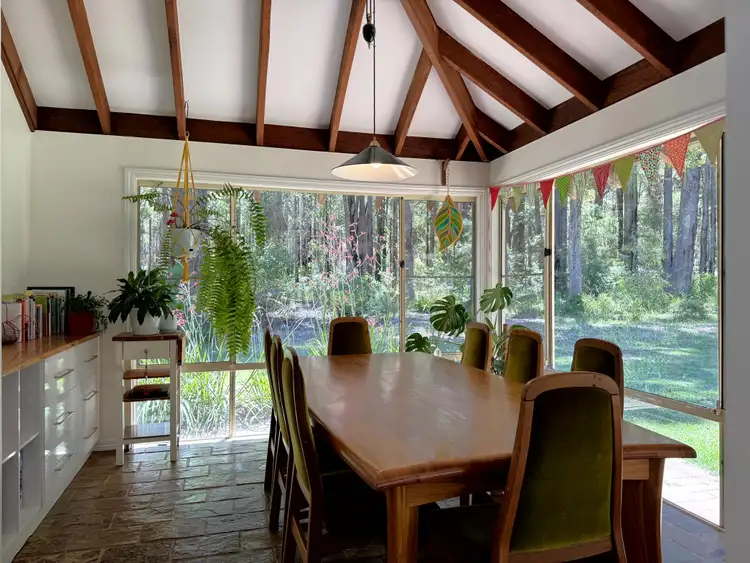 The spacious open-plan kitchen, family and dining area forms the true hub of the home and opens directly onto a perfectly positioned north-facing alfresco, overlooking manicured lawns and your very own forest. High raked ceilings, timber poles, rustic slate tiles and a cosy wood fire enhance the country charm, creating a holiday-at-home feel all year round.