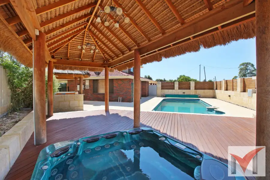 The private outside entertaining and pool has thatched pitched pergolas with spa, pool and easy care garden. It's easy to imagine long nights entertaining friends and family in this well presented, relaxed space. At the rear, a second generous patio creates another undercover area, and there is lawn and a workshop to the rear.