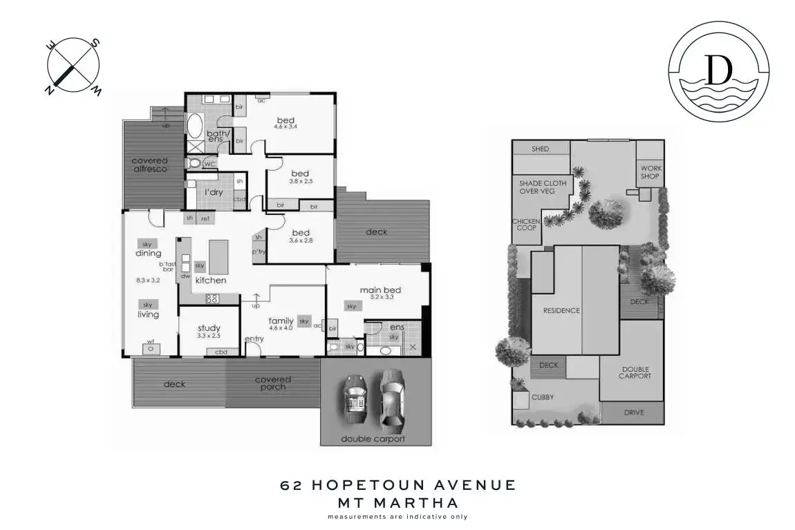 With a series of alfresco decks scattered around the grounds, you can entertain on the front deck taking in the sea breeze and the bay in front of the lush lawn; you can catch up with quiet conversation on the deck by the main bedroom, or barbecue on the side deck off the 2nd living area. All this, and the kids or grandkids will love the soft-fall toppings in the rear garden to ride bikes, play on the adventure playground, marvel at the dry riverbed, use their imagination in the sandpit, potter in the vermin-proof vegie garden, collect eggs from the chicken run, hang out in the cubby or you could use the colourful studio as a playhouse or art space. While the generous rear shed is big enough for a tinny or jetski, paddleboards, surfboards, beach toys or tools of the trade and direct access from Hopetoun Avenue, there's also a double carport via the access way.