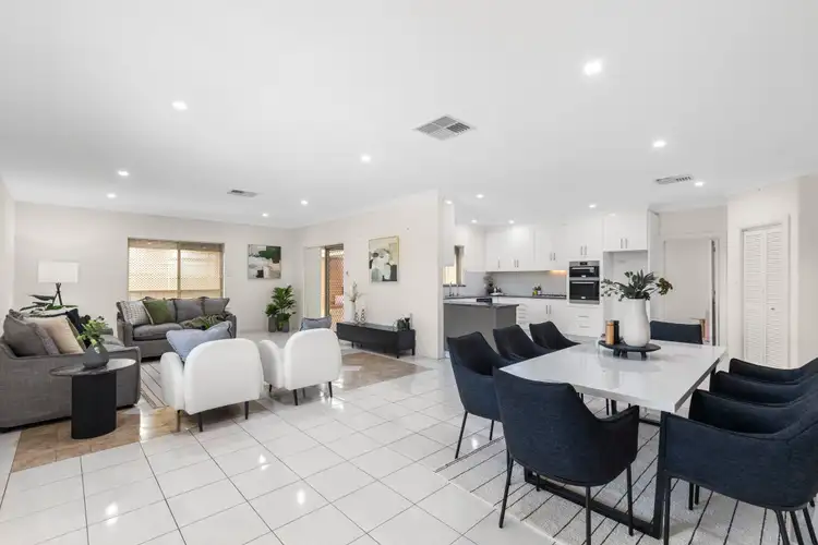 A sunken formal lounge steps up to the formal dining (or office/serene retreat/media room) - both these rooms adding further flexibility for family living. The expansive open plan kitchen/dining and living zone looks out to the manicured back garden; while the kitchen gleams with abundant white cabinetry, granite benchtops, breakfast bar, European appliances and walk-in pantry. Sliding doors create a flowing connection between the inside and extremely private, central outdoor entertaining courtyard - covered and sheltered on three sides from the weather, it benefits from a separate kitchen in the garage.