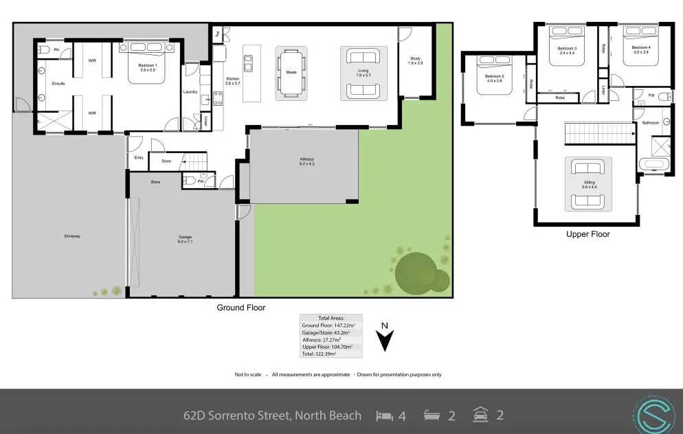 Welcome to 62D Sorrento Street, an exquisite near-new home that offers a unique blend of luxury, functionality, and style in one of Western Australia's most sought-after coastal neighbourhoods. Boasting over 320sqm of luxurious living on a low maintenance 398sqm block and oozing quality finishes throughout. You have space galore, featuring 4 huge bedrooms, 2 luxurious bathrooms plus a separate powder room, open plan family/kitchen/meals, home office, upstairs living/theatre and an awesome outdoor entertaining area, swimming pool, double garage & much more...