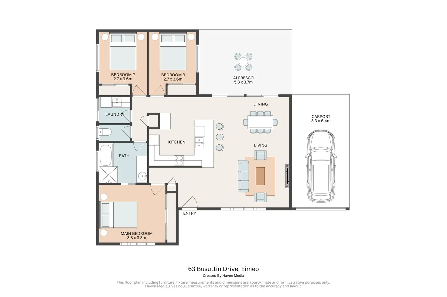- Comfortable & private bedrooms – The three carpeted bedrooms are thoughtfully separated from the main living zone. Each bedroom features air-conditioning, ceiling fans, built-in wardrobes & quality window coverings. The master bedroom has direct access to the modern, two-way bathroom creating a semi-ensuite feel, which features a built-in bath, glass screen shower, large vanity & a separate toilet