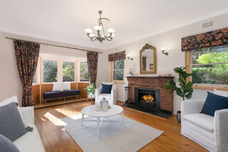 Elegant light-filled formal living room with feature wood-burning fireplace & bay window