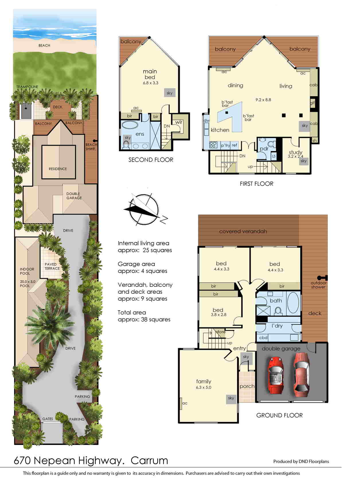 The sumptuous master suite encompasses the entire third floor, taking in awe-inspiring views of the sand and water, accompanied by a deluxe ensuite and both built-in, and walk-in robes and high ceilings. The ground floor welcomes ample accommodation, with three bedrooms (BIRS), family bathroom, laundry and rumpus/recreation room complete with projector screen and surround sound wiring. Relax in the outdoor entertainment zone to the rear with private beach access and a tranquil outdoor shower, or entertain guests in the vast indoor pool house, offering a solar heated and semi-automated 19m lap swimming pool and alfresco dining space with bricked-in BBQ.